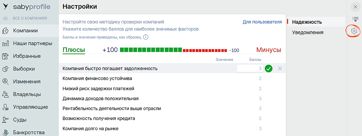 Каждый признак влияет на итоговую оценку — чем больше баллов, тем надежнее компания. Вы можете изменить вес каждого критерия: решающим — прибавить, несущественным — поставить «0».