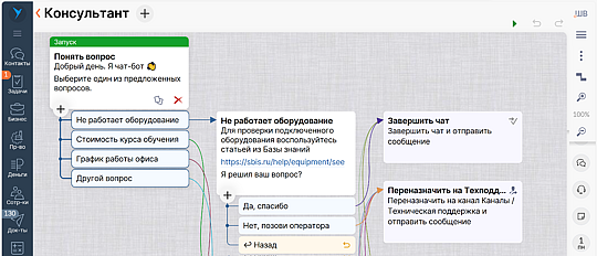 Создайте чат-бота. Введите название и загрузите аватар. Настройте диалоги, условия, действия. Разместите кнопки с часто задаваемыми вопросами, по которым бот будет присылать рекомендации или переназначать чат на специалистов.