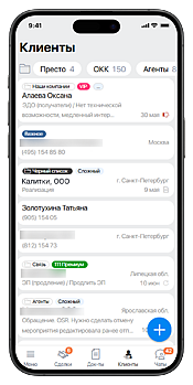 Раздел «Клиенты» теперь нагляднее. В пустом экране сразу видно, как добавить клиента, папки вынесли в удобную карусель сверху, а в общем списке отображается все самое важное, в том числе — контакты, ИНН и последнее взаимодействие.
