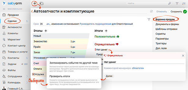 Если хотите, можете запланировать события с этим клиентом по другой теме. Например, не получилось продать услугу «Техобслуживание» — предложите клиенту купить комплектующие.