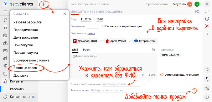 Создавать массовые письма стало еще удобнее — просто нажмите на «+» и без лишних кликов выберите тип: «При покупке», «День рождения» и т.д. Все этапы настройки сразу отображаются в карточке — больше не нужно переключаться от шага к шагу.