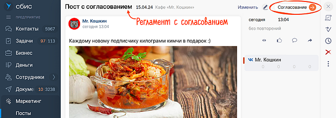 В Saby уже есть готовый регламент «Пост с согласованием». Выберите его, если нужно, чтобы контент проверил и одобрил ответственный за тему или другие сотрудники. Согласующим поступит новая задача.