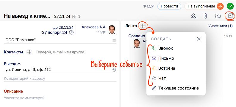 Связали события с нарядами и обращениями. Создавайте плановые и фиксируйте выполненные события с клиентом прямо в карточке наряда или обращения. Такое событие появится в шапке и ленте документа, а наряд или обращение — в карточке клиента.