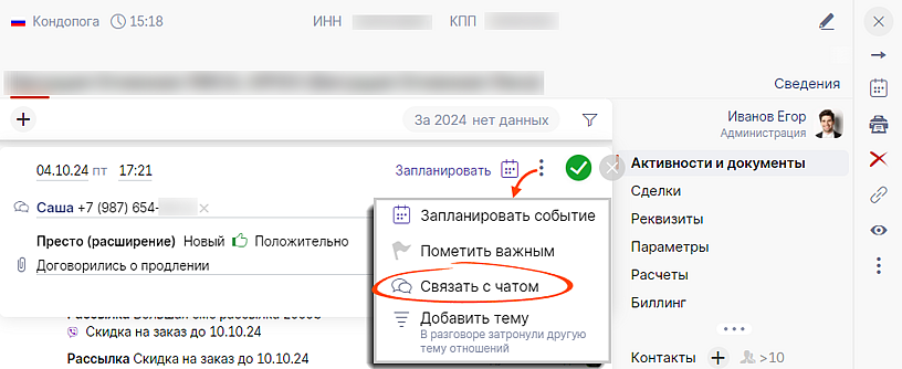 Фиксировать итоги общения с клиентом станет легче. Чаты с клиентами и записи видеовстреч теперь всегда под рукой. Вы сможете прикрепить их к карточке клиента и сделки. Создайте событие «Чат» в день общения с клиентом по чату — Saby свяжет их автоматически. Не успели или забыли зафиксировать такое событие сразу — привяжите его вручную.
