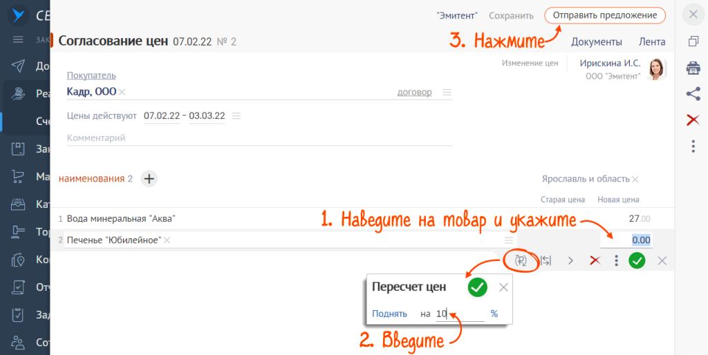 1. Поставщик создает документ «Согласование цен» в разделе «Реализации/Счета/Заказы». Указывает в нем новые цены — это можно сделать, выбрав актуальный прайс-лист из справочника, или поставить конкретный процент повышения/снижения стоимости на всю продукцию, при нажатии на значок
