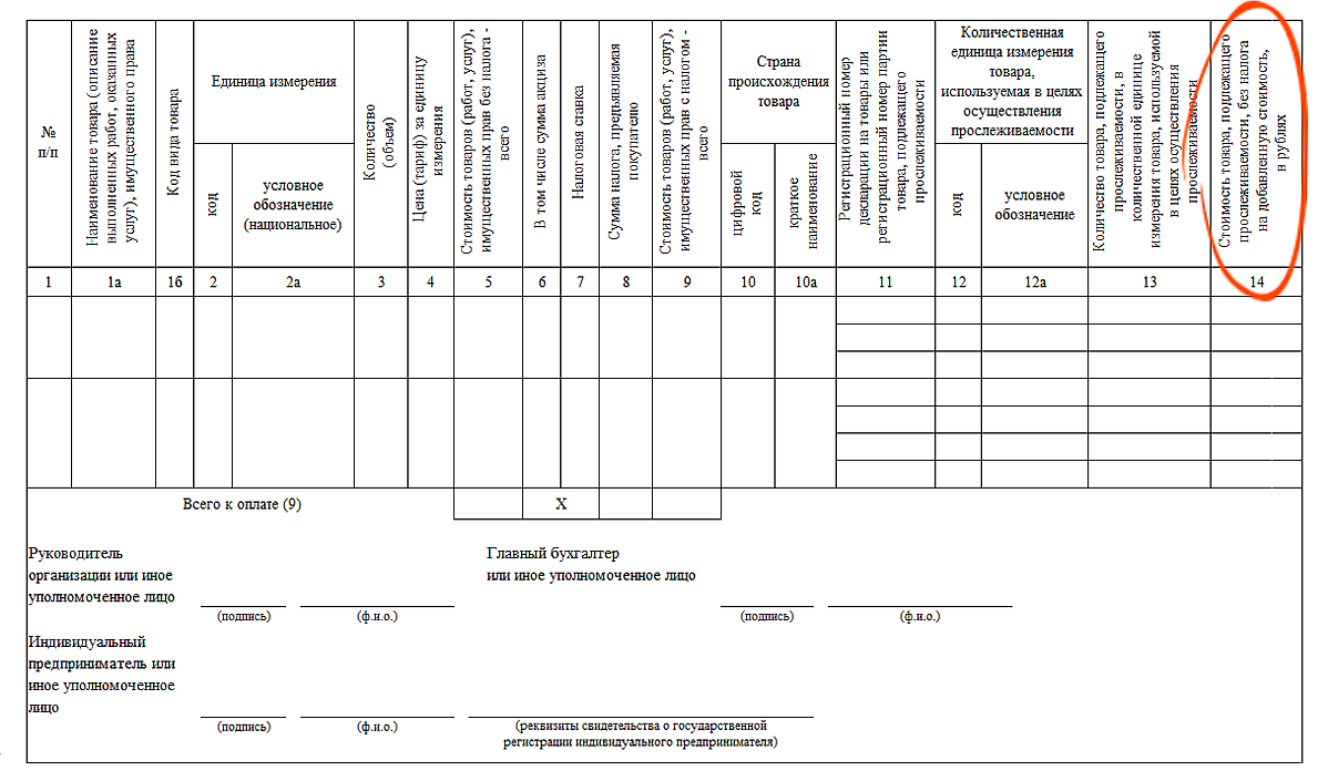 Добавлена графа 14 «Стоимость товара, подлежащего прослеживаемости, без налога на добавленную стоимость, в рублях».