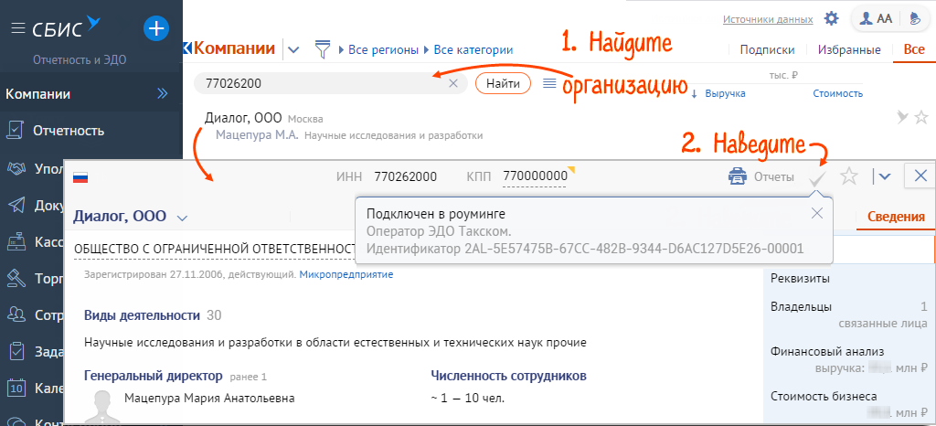 Это зависит от того, подключен ваш контрагент к роумингу или еще нет. Узнайте статус бизнес-партнера там же, где проверяли его оператора — в разделе «Компании». Обратите внимание, указан ли в статусе идентификатор участника ЭДО. СБИС сообщит, как только контрагент примет ваше приглашение. С этого момента можно начинать обмен документами.