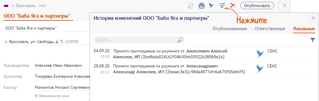Входящие приглашения СБИС принимает автоматически. Вы сразу можете обмениваться документами. Посмотреть входящие приглашения можно в карточке вашей организации в разделе «История изменений».