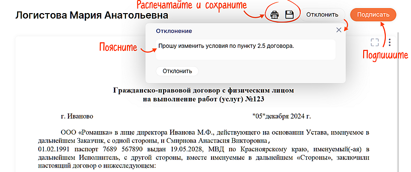 При клике на ссылку откроется онлайн-форма документа с кнопками «Подписать» и «Отклонить».