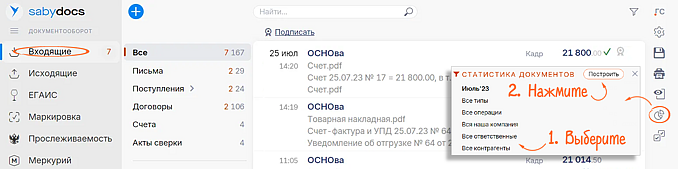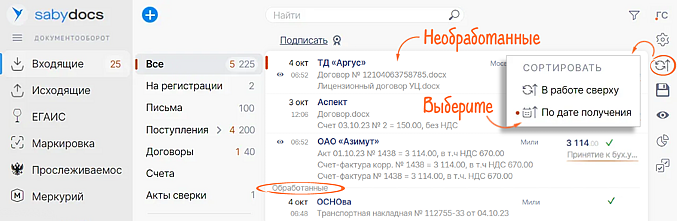 Список документов в разделе «Входящие» теперь состоит из 2 частей: все необработанные — наверху. Даже если документ пропустили, он не затеряется среди других, а будет на виду. Если хотите вернуть привычное отображение, отсортируйте входящие по дате получения.