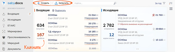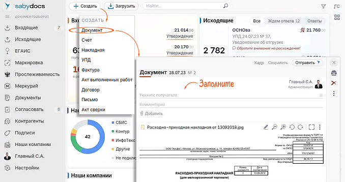 Saby автоматически распознает вложения и создает реализации, накладные и другие соответствующие карточки. Хотите отправить контрагенту документ в виде прикрепленного файла? Кликните «Создать» и выберите «Документ» — вам останется только указать получателя и отправить.