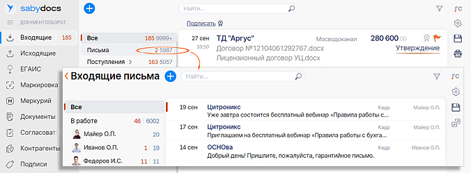 Количество неподписанных документов — не только в виджетах на главной, но и в разделах «Входящие» и «Исходящие». В блоке «В работе» они дополнительно сгруппированы по ответственным. В любой момент оценивайте загруженность сотрудников и перераспределяйте срочные задачи.