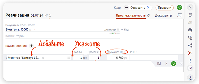 Заполните реализацию. Стоимость товара без НДС отразится в документе в данных о прослеживаемости.