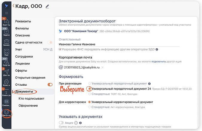 Вы можете формировать, принимать и обрабатывать УПД со стоимостью прослеживаемого товара без НДС. В разделе «Настройки/Наши компании/Документы» выберите универсальный передаточный документ 24.