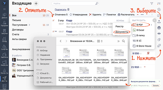 Храните сканы документов в локальной базе? У вас своя система папок? Теперь пополнять базу стало еще удобнее: при массовой выгрузке в pdf-формате файлы не склеятся в один документ — СБИС сохранит каждый в отдельный файл.