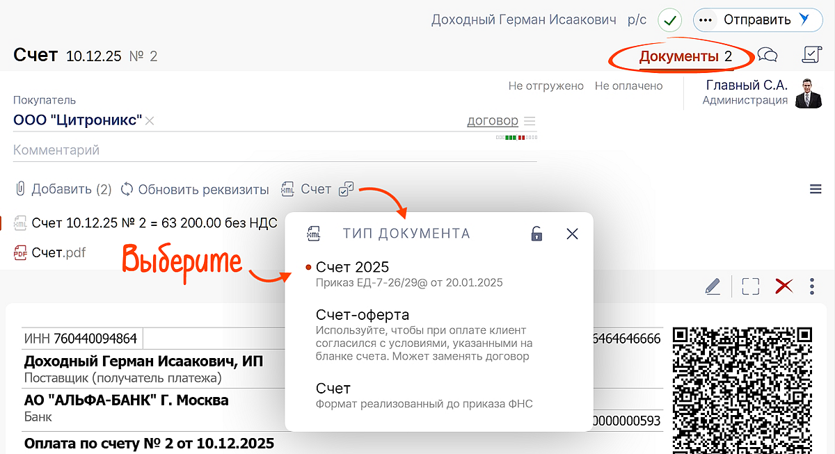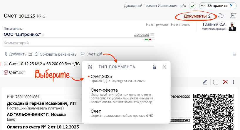 Определите тип прямо в конкретном счете на вкладке «Документы».