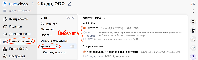 Чтобы использовать форму ФНС для всех счетов и контрагентов, настройте ее в разделе «Наши компании/Документы».
