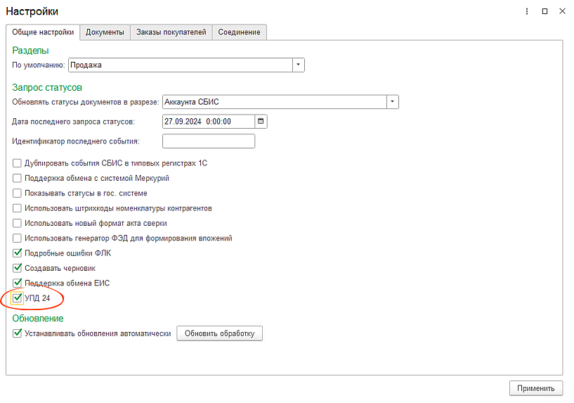 Для корректной работы внешней обработки включите поддержание нового формата УПД, поставив галочку в настройках модуля.