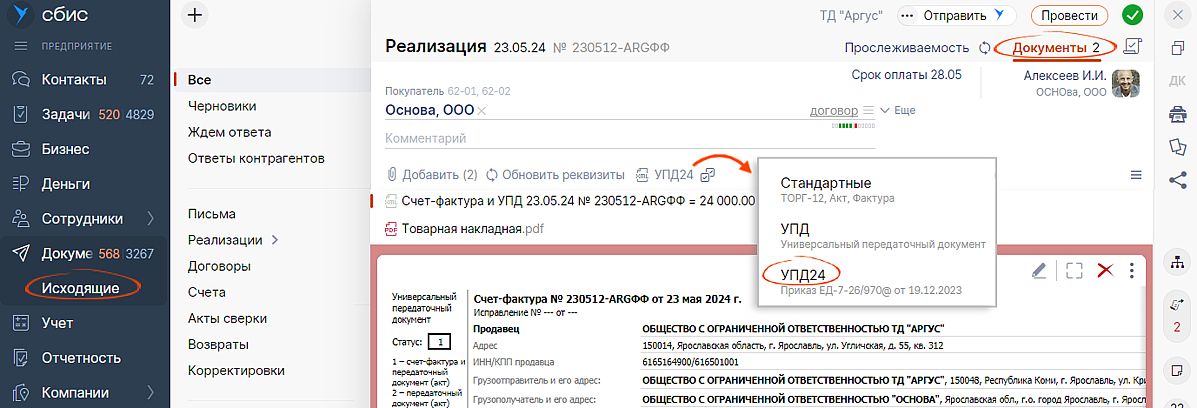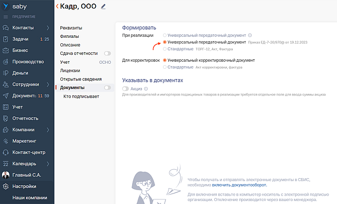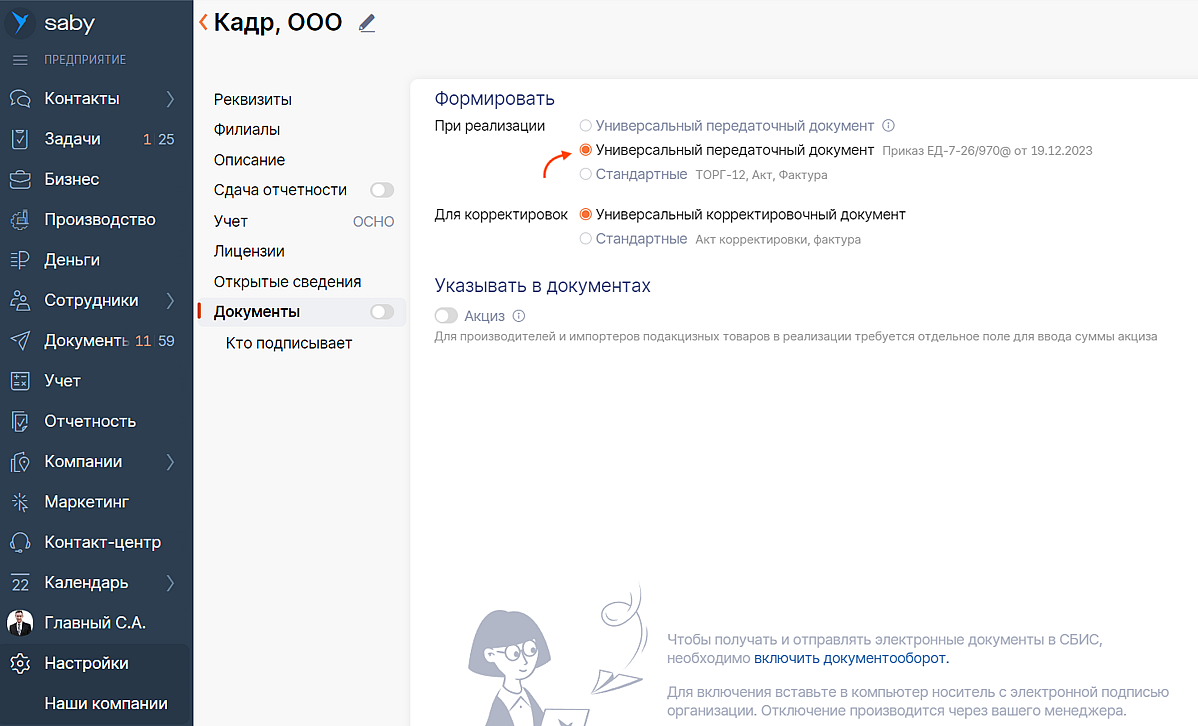 Подробнее о том, как выбрать формат УПД для всех документов, — в базе знаний.