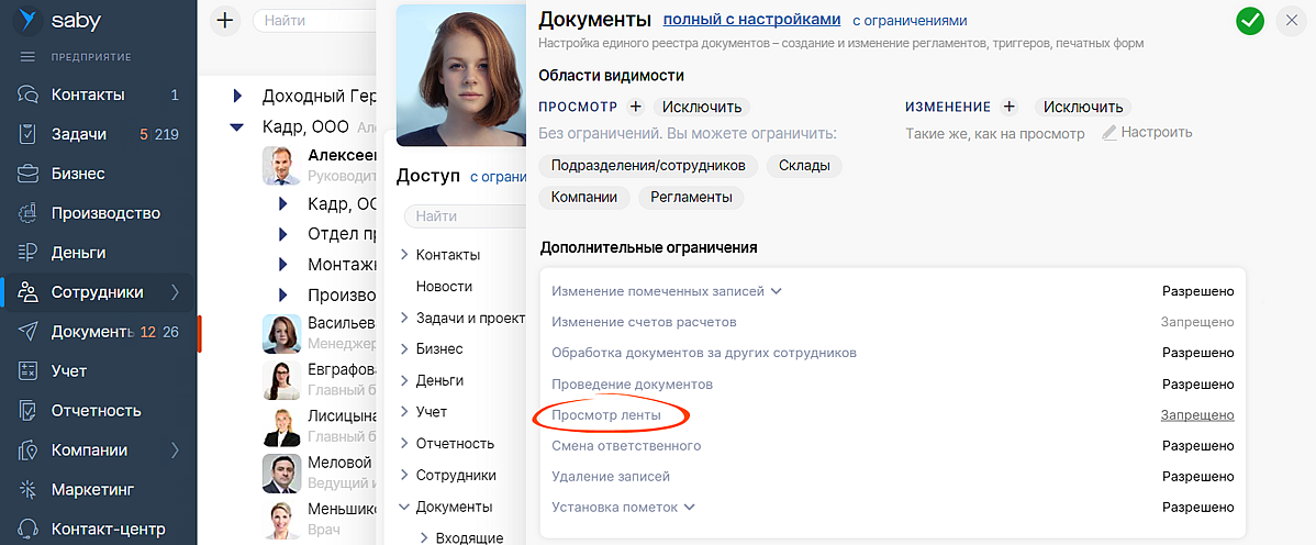 Добавили новое ограничение на «Просмотр ленты» во всех типах документов. В настройках роли от сотрудников можно скрыть переписку и историю прохождения документа.