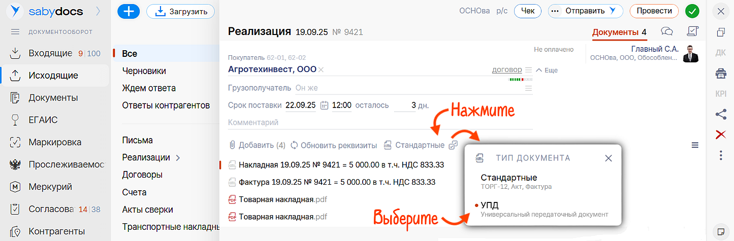 Если обмениваетесь документами в Saby — просто смените тип при их формировании. В личном кабинете уже включена генерация универсального передаточного документа (УПД).