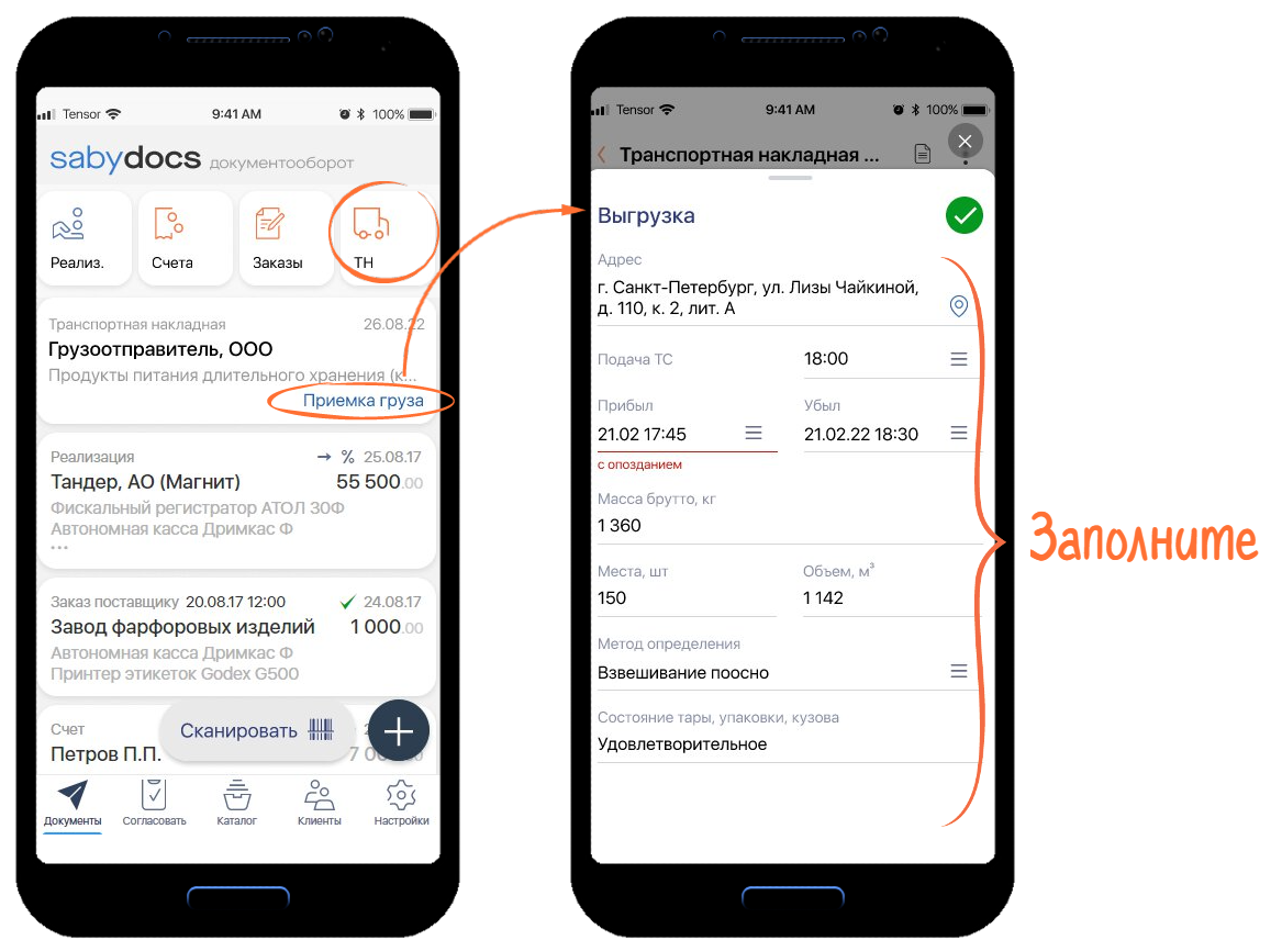 Теперь кладовщику грузополучателя не придется идти к компьютеру, чтобы подтвердить приемку груза. Заполнить данные по выгрузке легко прямо в мобильном приложении Saby Docs. Приложение предложит автоматически заполнить поля по данным грузоотправителя. Если какие-то данные отличаются, вы можете их исправить.