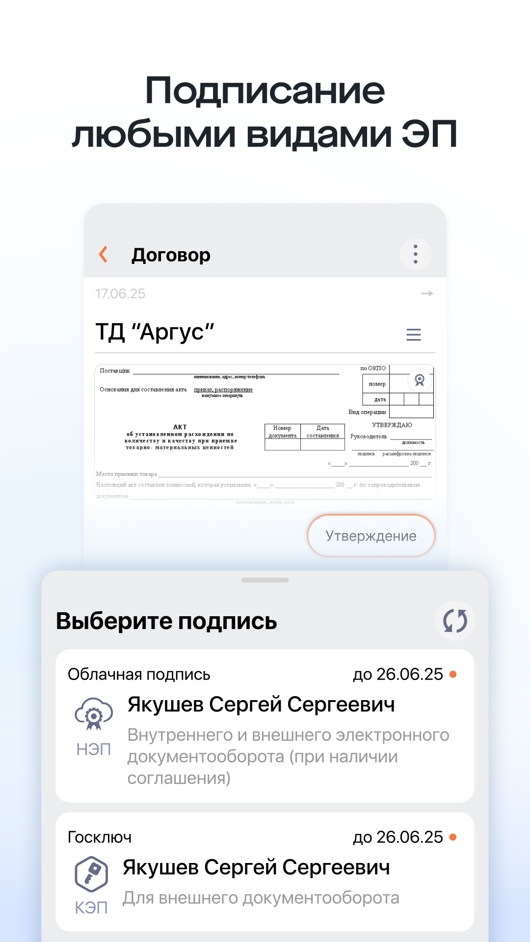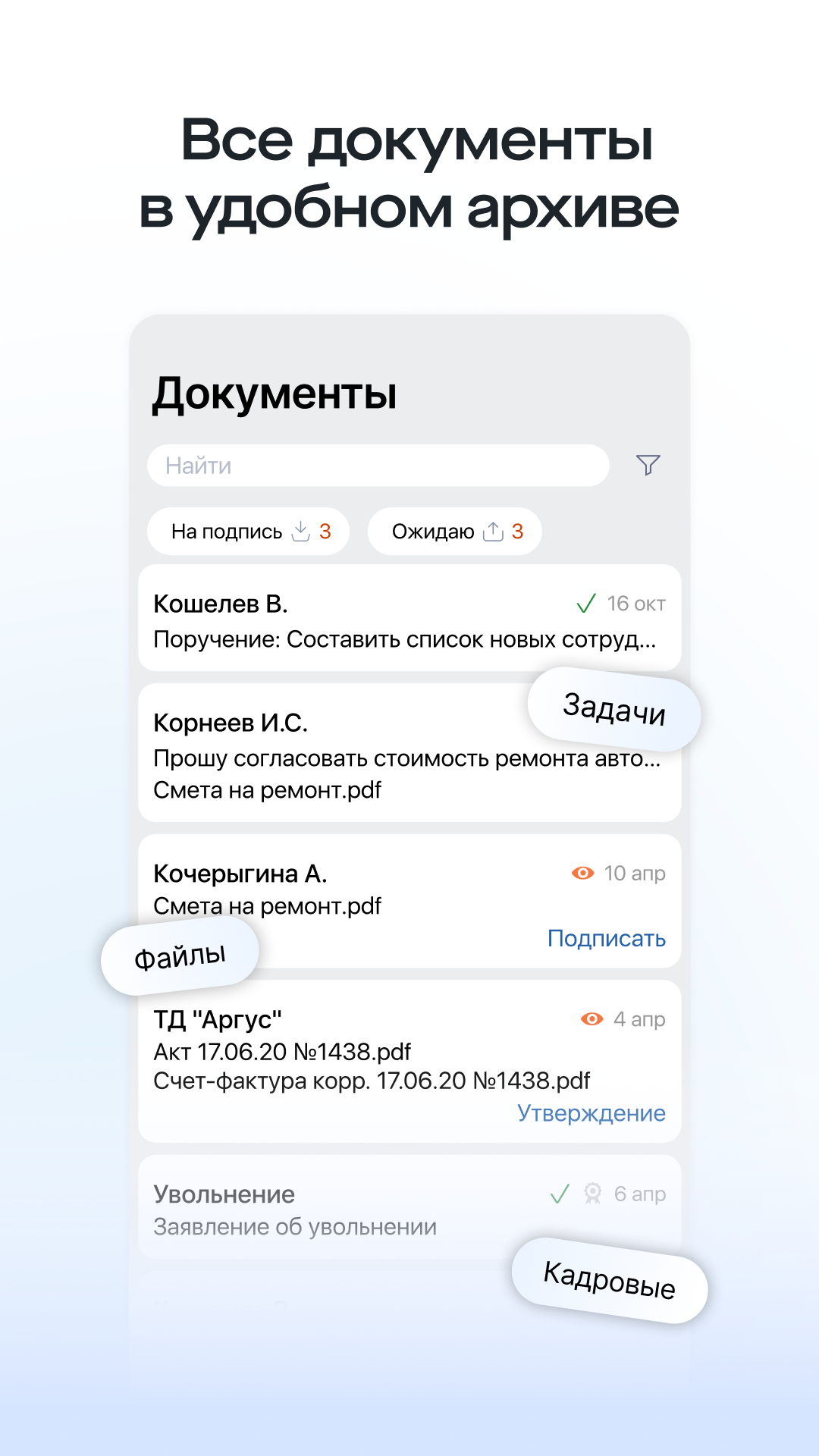 Подпись документов в один клик — договоры, акты, кадровые и другие документы от компаний и физических лиц.