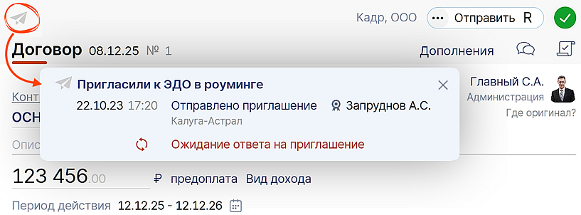 Система автоматически направляет приглашение. Пока контрагент его не примет, у документа будет стоять статус «Пригласили к ЭДО».
