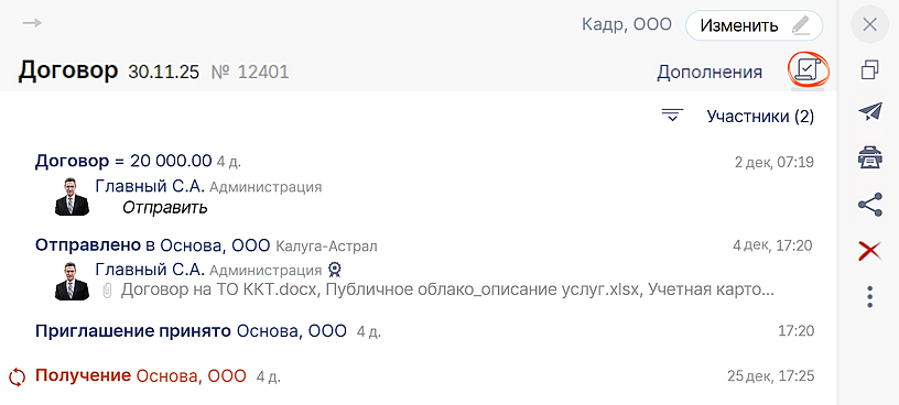 Как только контрагент примет приглашение, статус автоматически изменится на «Отправлено», а документ будет доставлен. Посмотреть все события с конкретным временем по каждому из них вы можете в ленте .