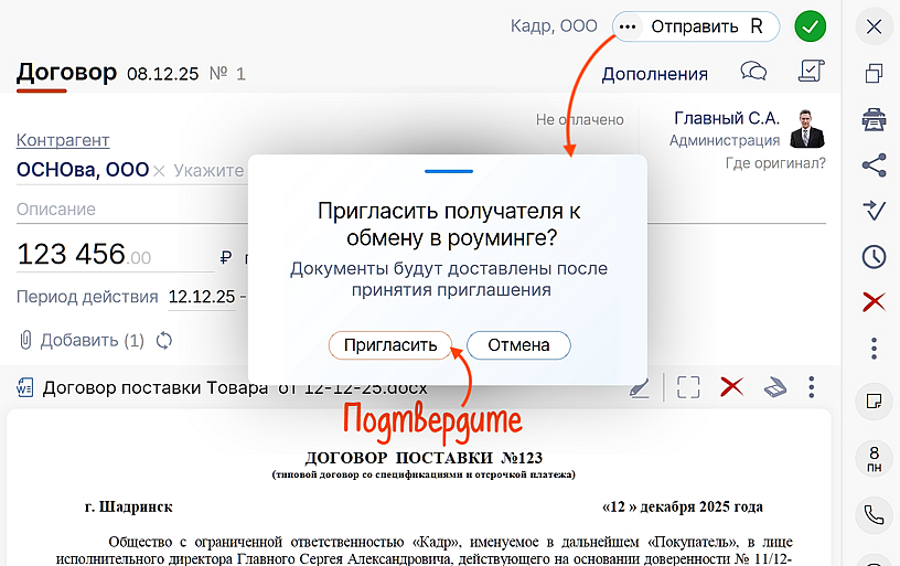 Вы просто создаете документ, нажимаете «Отправить» и подтверждаете готовность пригласить контрагента к обмену.