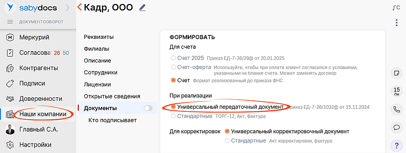 Просто переключите настройки в разделе «Наши компании» на вкладке «Документы».