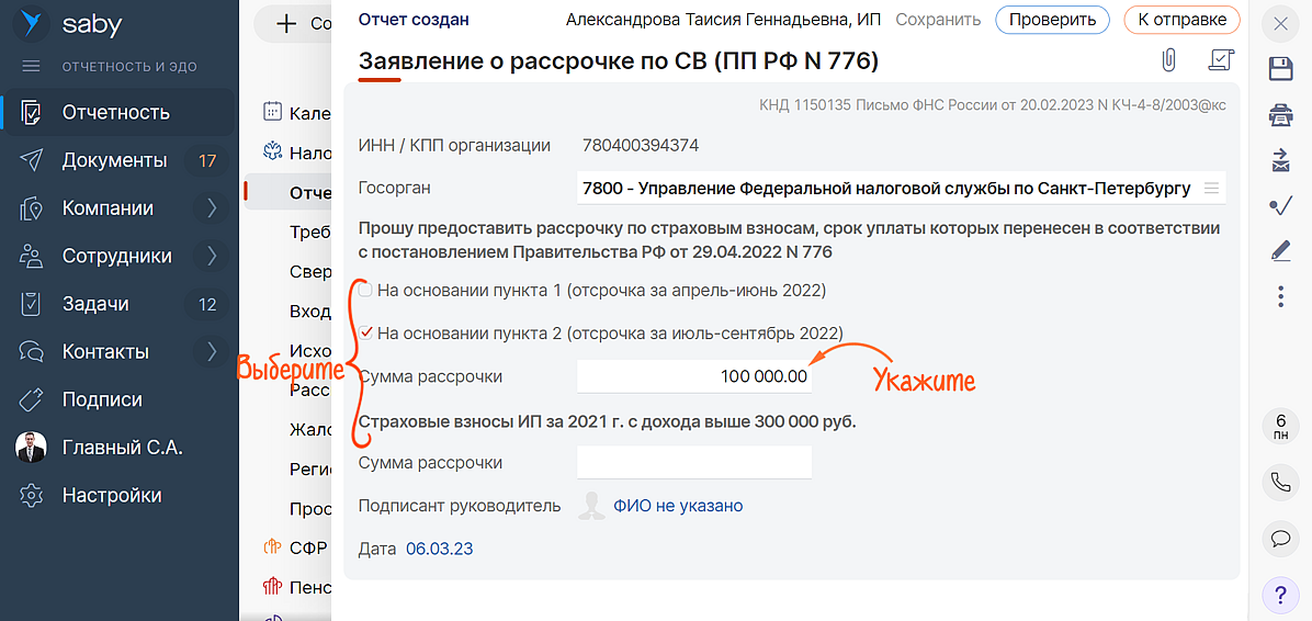 В разделе «Отчетность/Налоговая» создайте форму «Заявление о рассрочке по СВ (ПП РФ N 776)» (КНД1150135). Заполните сумму и выберите, на основании какого пункта постановления вы имеете право ее получить: