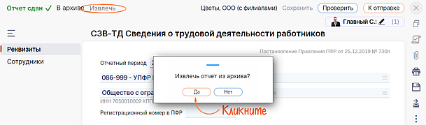 Если отчет сдавался более 1,5 лет назад, предварительно найдите его на вкладке «СФР/Трудовые книжки» и извлеките из архива.