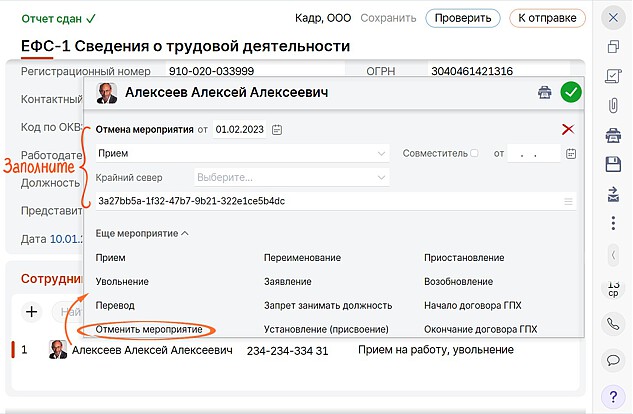 Если в ответ СФР пришлет отказ «Не найдены исходные сведения для отменяемого мероприятия», еще раз уточните, все ли данные исходного мероприятия и корректировки совпадают.