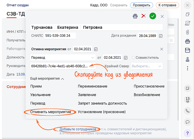 Создайте отчет на сотрудника, выберите тип «Отмена мероприятия». Идентификатор скопируйте из уведомления. Проверьте соответствие других данных по мероприятию в уведомлении («ФИО/СНИЛС», «Дата», «Тип» «Совместитель» и др.) и отправьте отчет.