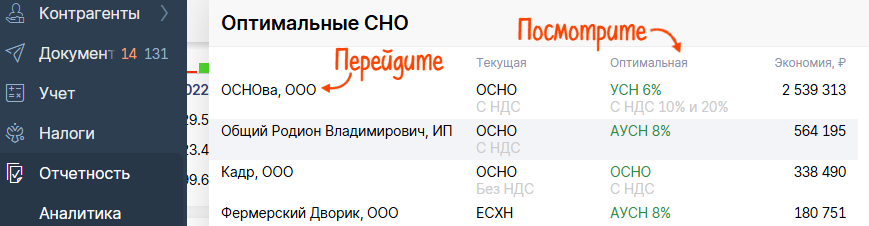Если у вас несколько организаций. Получите сводную таблицу по всем. Напротив каждой вашей компании появятся данные о текущей СНО, оптимальной, а также экономии, которая вас ожидает при смене режима. Кликните на организацию для перехода к индивидуальному калькулятору по ней.