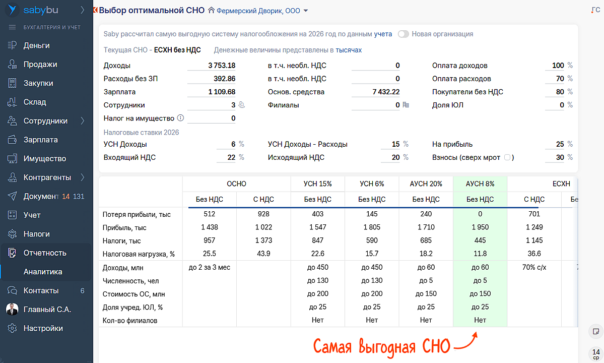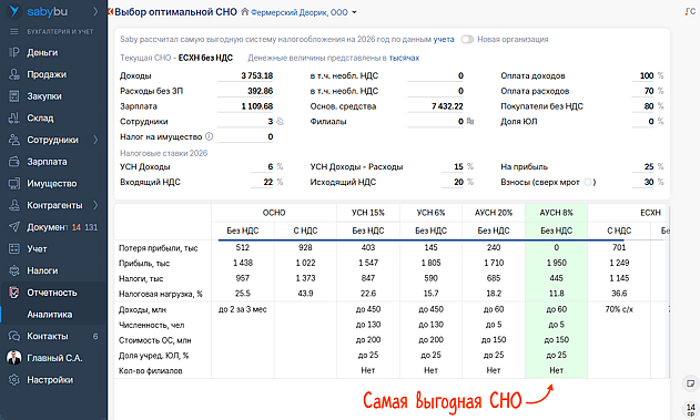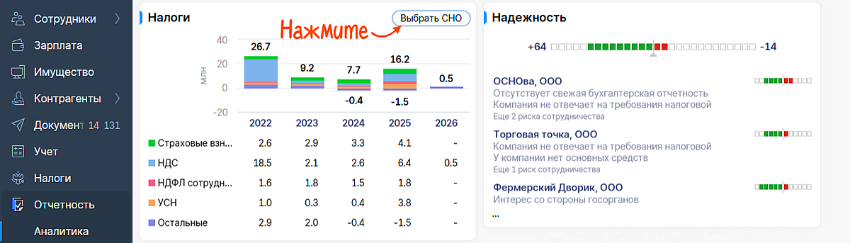 Вы всегда можете вернуться к расчетам, нажав на кнопку «Выбор СНО» в разделе «Аналитика».