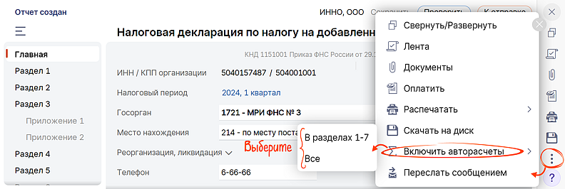 Включайте авторасчет конкретного поля в отчете, кликнув на значок ∑. Чтобы СБИС рассчитал все итоговые поля, выберите «Включить все авторасчеты» в меню по трем точкам на правой панели. Для НД по НДС начиная с периода за II квартал 2024 из этого же меню можно включить авторасчет только для разделов 1–7.