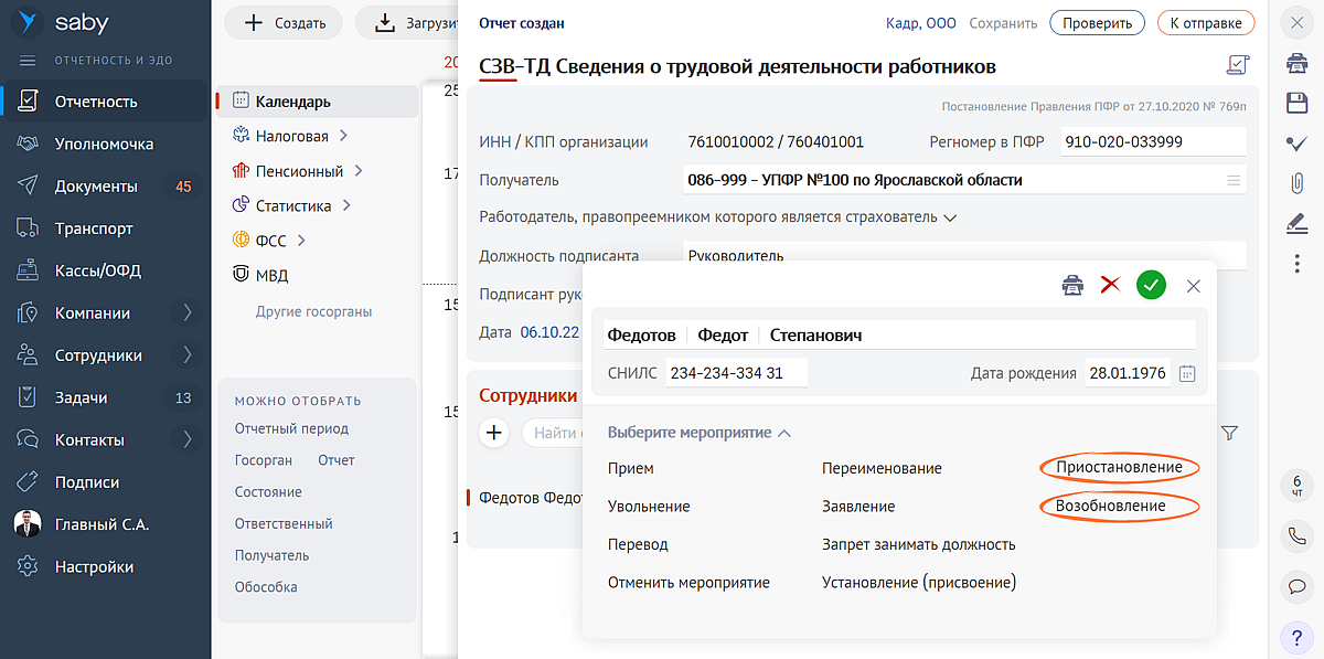 Создайте СЗВ-ТД как обычно. Добавьте сотрудника. В поле «Выберите мероприятие» нажмите «Приостановить» или «Возобновить». Заполните необходимые поля и сохраните форму. Когда внесете сведения по всем мобилизованным сотрудникам, отправьте отчет.