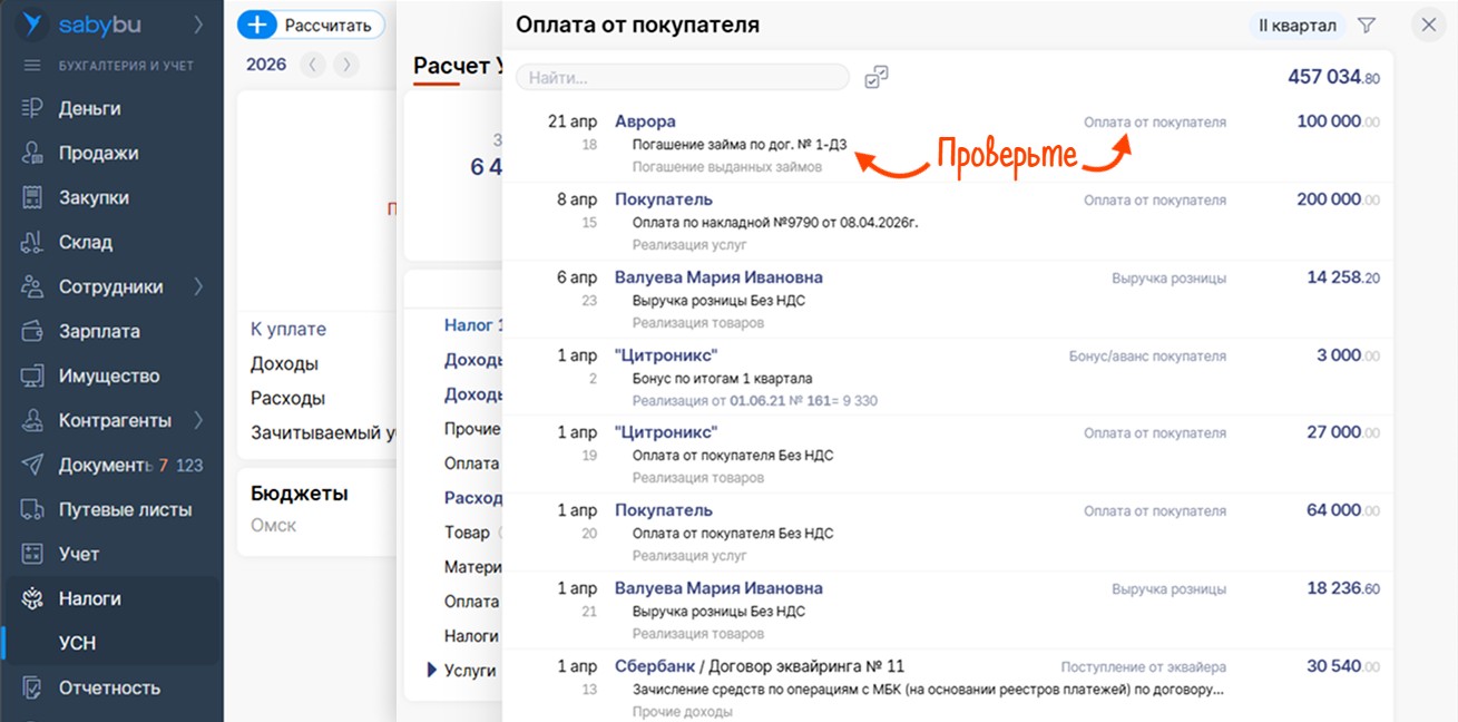 Если платеж не должен попадать в доход, например, возврат займа, проверьте тип операции.