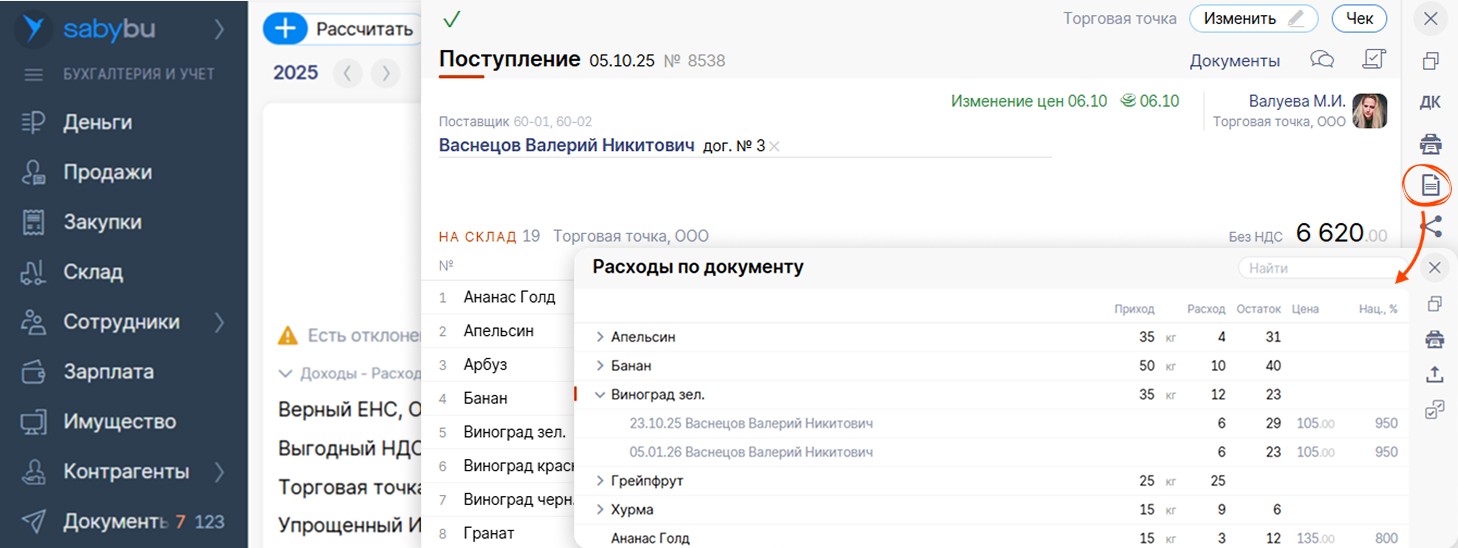 в столбце «Списание» → проверьте, что товар полностью реализован или списан. Для этого откройте отчет «Расходы по документу» в поступлении. Если товар продан в следующем квартале — себестоимость попадет в расходы в следующем периоде.