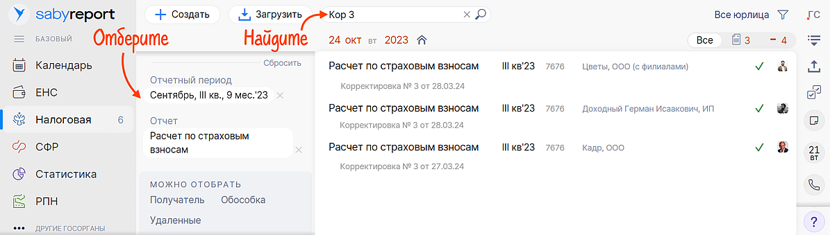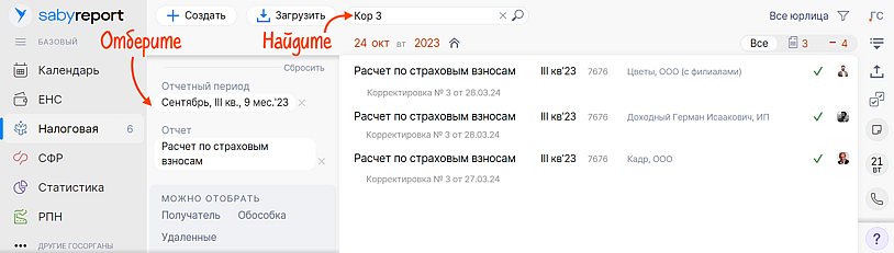 Если отчетов у вас много, можно заранее отобрать нужный период и форму. Например, корректировку № 3 к РСВ за III квартал 2023 года.