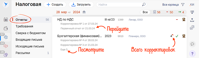 Теперь все на виду: под каждым отчетом — список всех его корректировок. Переход к любой из них — в один клик.