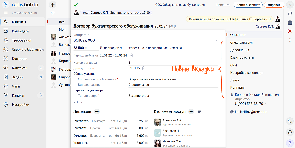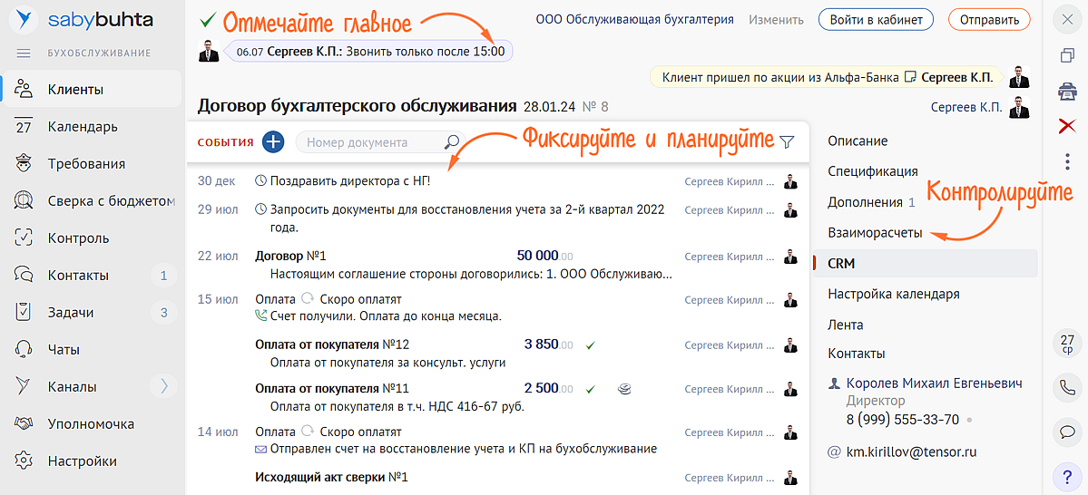 Мы собрали информацию по клиенту и инструменты для комфортной работы с ним в одном месте. Кликайте на название фирмы в разделе «Клиенты» и переходите в карточку договора. Все необходимое уже здесь: контакты, настройка календаря индивидуальных событий, лента с историей переписки и операций, а также все для CRM и ЭДО.
