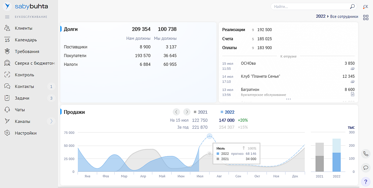 На главной странице теперь удобный дашборд с виджетами. В них общая информация по работе с обслуживаемыми компаниями: сколько поступило оплат, кто должен нам, а кому мы, с кем нужно созвониться, а кому написать и др.