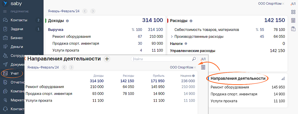 Например, компания занимается продажей спортивного оборудования, а также оказывает услуги проката и ремонта. Чтобы понять, какой из видов бизнеса прибыльнее, — посмотрите итоги деятельности на странице «Учет».