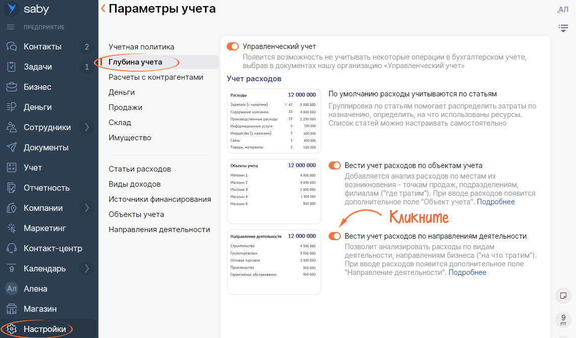 В разделе «Настройки/Параметры учета/Глубина учета» включите учет расходов по направлениям деятельности.