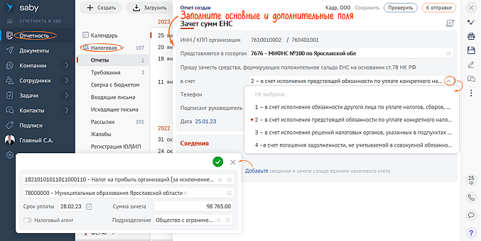 Создайте форму «Зачет сумм ЕНС» (КНД 1150057) в разделе «Отчетность/Налоговая». Выберите один из четырех вариантов зачета в поле «в счет»: 1 — исполнения обязанности другого лица по уплате налогов, сборов, страховых взносов, пеней, штрафов, процентов;