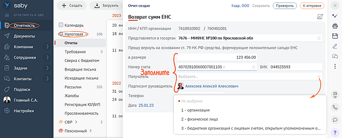 В разделе «Отчетность/Налоговая» создайте форму «Возврат сумм ЕНС» (КНД 1112542). Введите данные о получателе и номере счета, заполните сумму переплаты, проверьте и отправьте форму. Если положительное сальдо ЕНС меньше заявленной суммы, вам вернут только ее часть.