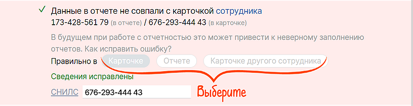Исправляйте ошибки по сотрудникам за пару кликов. Saby сверит сведения о работнике в его карточке и отчете. Если отличается фамилия, СНИЛС или ИНН, при проверке система покажет ошибку и предложит выбрать: правильно в отчете, карточке или карточке другого сотрудника. Съехали данные по всем сотрудникам — примените решение для всех ошибок.